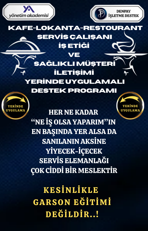 Eğer onca emek ve yatırım ile kurduğunuz ve onun yaşaması için çoğunlukla kendi hayatınızı bile ertelediğiniz işletmenizin servis elemanlarınızın basit hatalarından dolayı geleceğinden vurulmamasını ve müşterilerinizin tercih sıralamasında öncelik almasını istiyorsanız KAFE-LOKANTA-SERVİS ELEMANI EĞİTİM ÇALIŞMAMIZI bir inceleyiniz deriz.